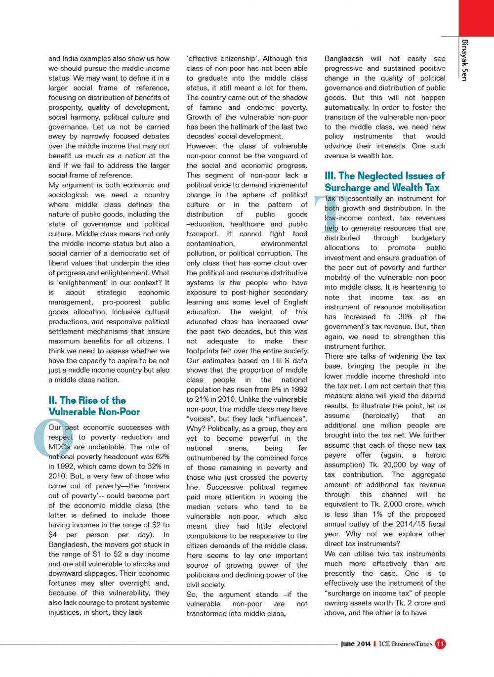 মধ্যবিত্তের অর্থনীতিতে উত্তরণ চাই :সবশেষে, মানবসম্পদ উন্নয়ন নিয়ে একটা কথা বলতে চাই। আমরা শুধু মধ্য আয়ের দেশ নয়, মধ্যবিত্তের দেশে পরিণত হতে চাই। কেবল ভৌত অবকাঠামো নির্মাণ করে এটা সম্ভব নয়। এর জন্য দরকার দক্ষ ও প্রশিক্ষিত কর্মীবাহিনী; দরকার উন্নত মানের শিক্ষা ও গবেষণা ব্যবস্থা। সংস্কৃতি খাতে যত ব্যয় হয়েছে, তার সিকিভাগও ব্যয় হয় না এ দেশে বিজ্ঞান ও প্রযুক্তি খাতে। ‘আইসিটি’ আর বিজ্ঞান গবেষণা এক জিনিস নয়। শিক্ষা খাতে তাই ব্যয় বরাদ্দ আরও বেশি হারে বাড়ানো প্রয়োজন। ভারতে যেমন বিশ্বখ্যাত উচ্চ শিক্ষার প্রতিষ্ঠান (যথা_ আইআইটি এবং আইআইএম) রয়েছে, সে রকম প্রতিষ্ঠান সামান্য সরকারি সহায়তা পেলে আমাদের দেশেও গড়ে উঠতে পারে। বস্তুত পিপিপির জন্য উঁচু মানের শিক্ষা প্রতিষ্ঠান তৈরি করা একটি জরুরি বিবেচনা হতে পারে। এ ধরনের শিক্ষা প্রতিষ্ঠান হলে আগামী ১০ বছরে আমাদের উচ্চশিক্ষার মান শুধু নয়, আমাদের আমলাতন্ত্রের দক্ষতা ও প্রশিক্ষণের চিত্রটাই আমূল বদলে যাবে। একটি মধ্যবিত্ত অর্থনীতি নির্মাণের জন্য এটি অবশ্যকীয় পূর্বশর্ত। এ ব্যাপারে এ বাজেটের কাছ থেকে আরও বেশি কিছু সুনির্দিষ্ট প্রস্তাব আশা করেছিলাম।