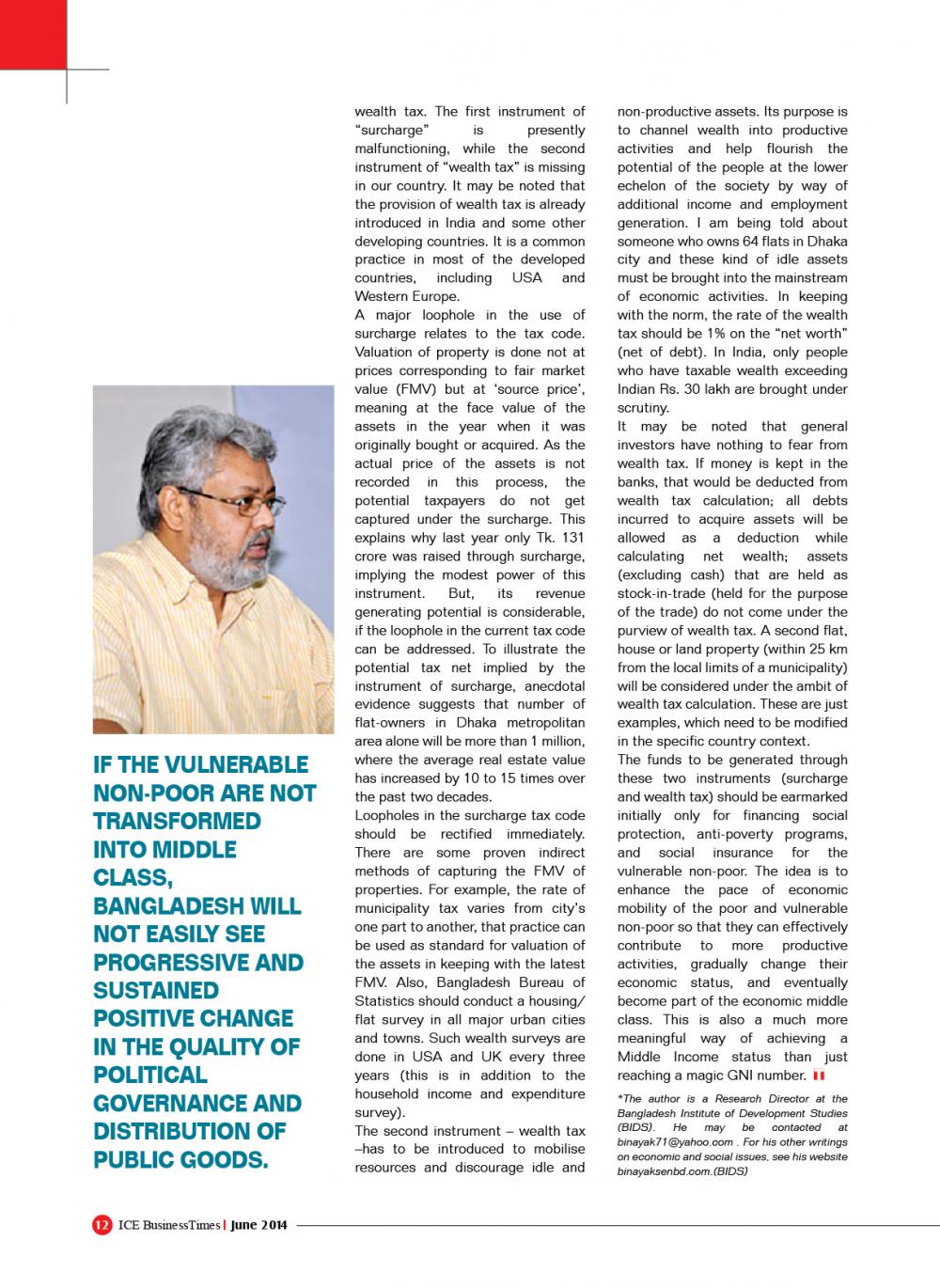 সম্পদ আহরণ তথা অর্থায়নের প্রশ্ন :বাজেটে যথার্থভাবেই স্থানীয়ভাবে সম্পদ আহরণের ওপর জোর দেওয়া হয়েছে এবং প্রত্যক্ষ কর, বিশেষত আয়করের ওপর গুরুত্ব দেওয়া হয়েছে। বিত্তশালীরা বেশি হারে আয়করের ওপর ‘সারচার্জ’ দেবেন, এটাও ঠিক আছে সুষম উন্নয়নের স্বার্থে। কিন্তু এ দেশে এখনও ‘সম্পদ কর’ (ওয়েলথ ট্যাক্স) নেই। যেমনটা আছে পাশের দেশ ভারতে বা পাশ্চাত্যের উন্নত দেশে। এটা বাস্তবায়িক হলে অনায়াসে ১০০০-২০০০ কোটি টাকা আহরণ করা যেত। আয়করের সারচার্জের ক্ষেত্রেও সম্পত্তির মূল্যায়নে ‘ফেয়ার মার্কেট ভ্যালু’ প্রয়োগ করা উচিত ছিল। তবে শুধু স্থানীয় উদ্যোগে সম্পদ সমাবেশ করাই যথেষ্ট নয়। আমরা এখনও স্বল্পোন্নত দেশের কাতারে রয়েছি। আরও কিছুদিন সেই তালিকায় থাকব। সে ক্ষেত্রে কম সুদে বৈদেশিক সাহায্য জোরদারভাবে সংগ্রহের প্রতি আমাদের আরও সচেষ্ট হওয়া উচিত।